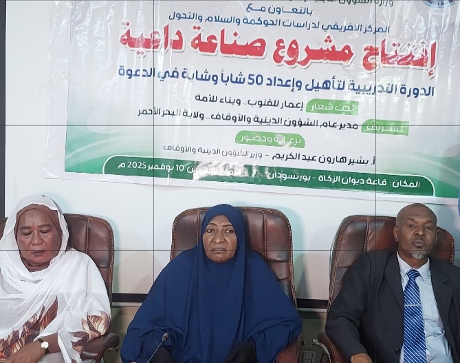 في إطار الاهتمام بالدعاة وتمكين وتوصيل الرسالة الدعوية للجميع  .. دشنت وزارة الشئون الدينية والأوقاف ومنظمة همة للاعمار بالتعاون مع المركز الافريقي لدراسات الحوكمة والسلام والتحول، افتتاح مشروع صناعة داعية لتأهيل(50 ) شابا وشابة تحت شعار إعمار للقلوب وبناء للأمة .
